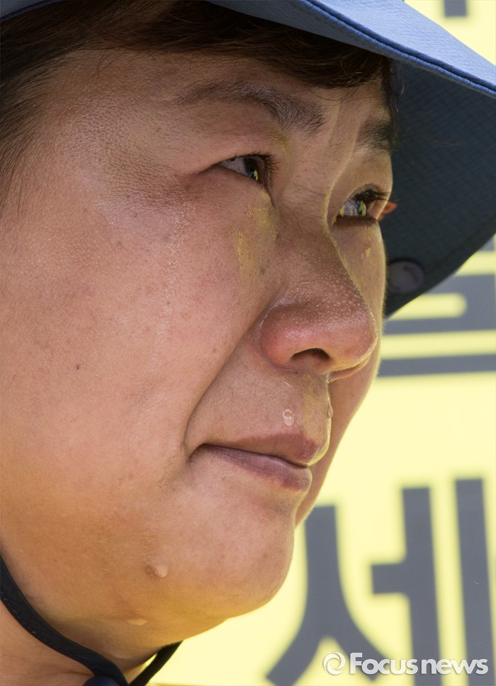 (서울=포커스뉴스) 세월호 참사 800일을 하루 앞둔 22일 오전 서울 종로구 광화문 광장에서 열린 '세월호 특별법 개정 촉구와 800일 계기수업 선포' 기자회견에 참석한 고 오영석군 어머니 권미화씨가 눈물을 흘리고 있다.