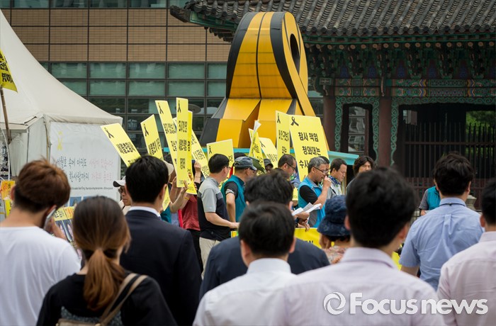 (서울=포커스뉴스) 세월호 참사 800일을 하루 앞둔 22일 오전 서울 종로구 광화문 광장에서 전국교직원노동조합 조합원들이 '세월호 특별법 개정 촉구와 800일 계기수업 선포' 기자회견을 갖고 있다.