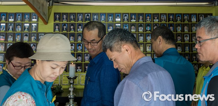 (서울=포커스뉴스) 세월호 참사 800일을 하루 앞둔 22일 오전 서울 종로구 광화문 광장에서 열린 '세월호 특별법 개정 촉구와 800일 계기수업 선포' 기자회견을 마친 전국교직원노동조합 조합원들이 광화문 416가족분향소를 찾아 묵념 후 발걸음을 돌리고 있다.