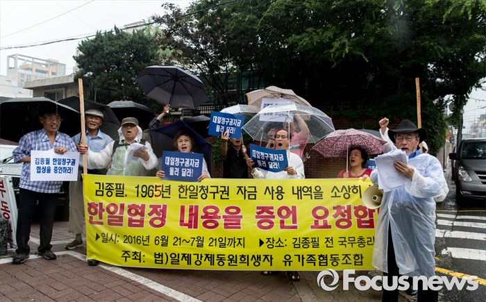 (서울=포커스뉴스) 22일 오후 서울 중구 신당동 김종필 전 총리 자택 앞에서 일제 강제동원희생자유가족협동조합 및 아시아태평양 전쟁희생자 한국유족회 회원들이 '한일협정 당시 일본외상 오히라 와 메모로 합의한 역사의 진실을 밝힐 것'을 촉구하고 있다.