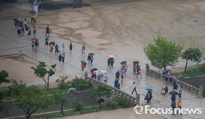 (서울=포커스뉴스) 중부지방에 첫 장맛비가 내리는 22일 오후 서울 경복궁에서 관광객들이 빗줄기 속에 나들이를 즐기고 있다. 기상청은 이번 장마전선이 오늘 밤 다시 남하해 비가 소강상태를 보였다가 모레 다시 북상할 것으로 전망했다.