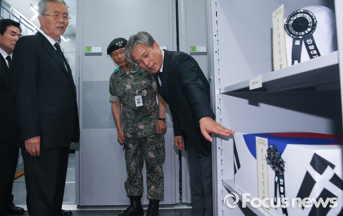 (서울=포커스뉴스) 김종인 더불어민주당 비대위 대표와 의원들이 22일 오후 서울 동작구 국립서울현충원 내 국방부 유해발굴감식단 중앙감식소를 방문해 발굴된 유해의 봉안 및 안장 과정 등에 대한 설명을 듣고 있다.