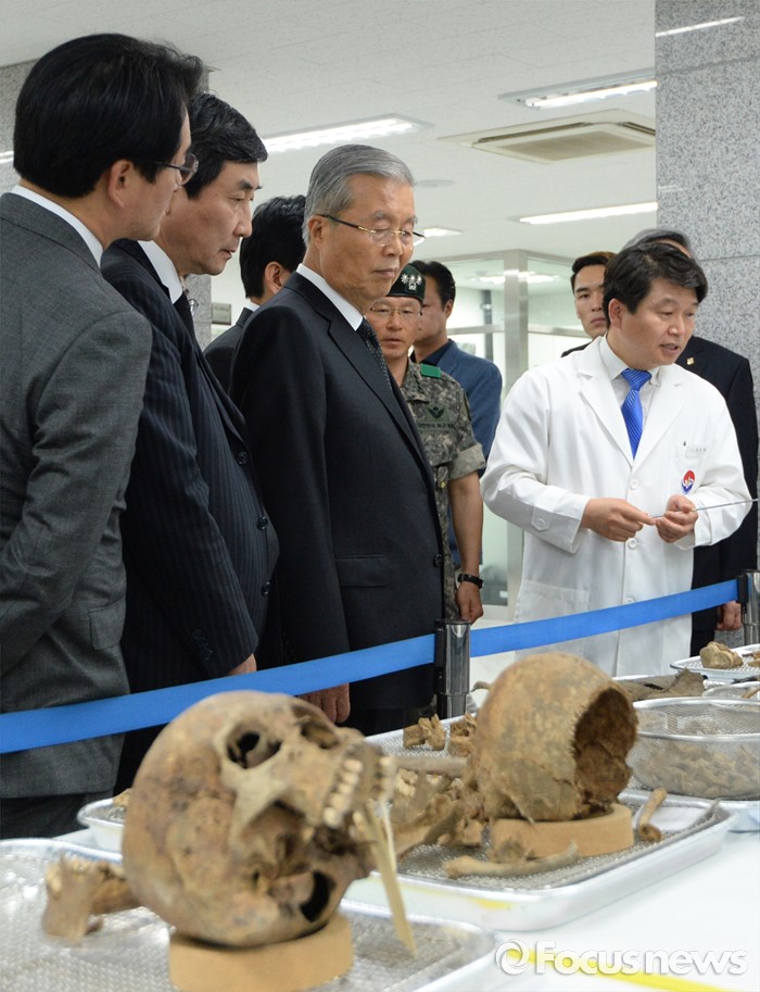 (서울=포커스뉴스) 김종인 더불어민주당 비대위 대표와 의원들이 22일 오후 서울 동작구 국립서울현충원 내 국방부 유해발굴감식단 중앙감식소를 방문해 감식 중인 유해를 살펴보고 있다.