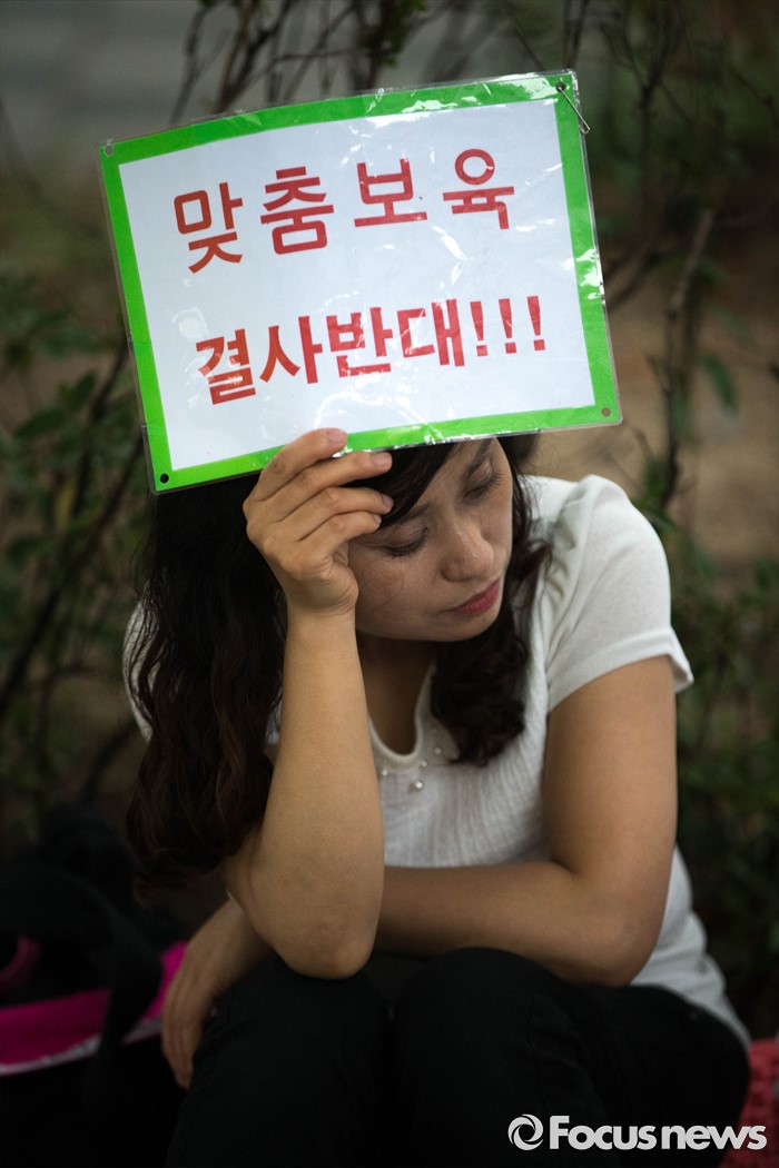 (서울=포커스뉴스) 22일 오후 서울 여의도 산업은행 본점 후문에서 한국가정어린이집연합회 비대위가 주최하는 '맞춤형 복지 시행 반대 단식 농성'이 열리고 있다.