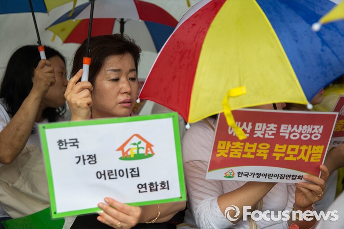 (서울=포커스뉴스) 22일 오후 서울 여의도 산업은행 본점 후문에서 한국가정어린이집연합회 비대위가 주최하는 '맞춤형 복지 시행 반대 단식 농성'이 열리고 있다.