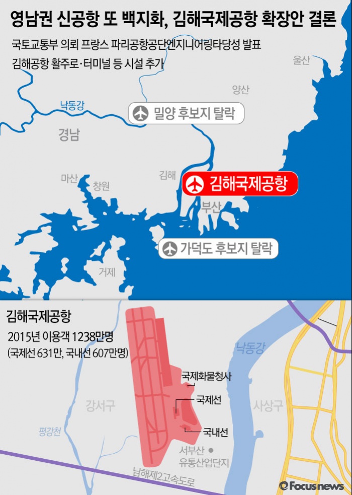 국토교통부는 지난 21일 프랑스 용역업체인 ADPi의 동남권 신공항 사전 타당성 용역 결과에 따라 밀양이나 부산 가덕도에 공항을 신설하는 대신, 김해공항을 확장한다고 발표했다.