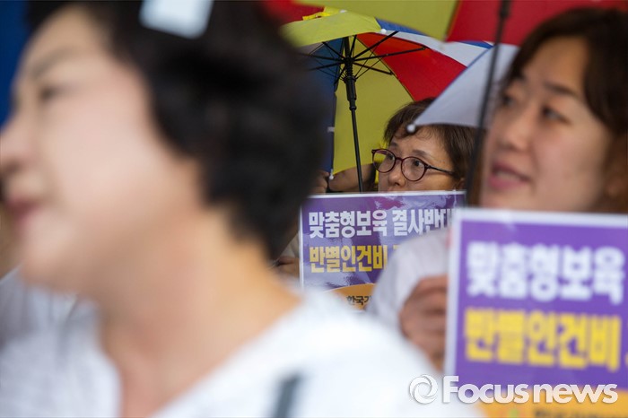 (서울=포커스뉴스) 22일 오후 서울 여의도 산업은행 본점 후문에서 한국가정어린이집연합회 비대위가 주최하는 '맞춤형 복지 시행 반대 단식 농성'이 열리고 있다.