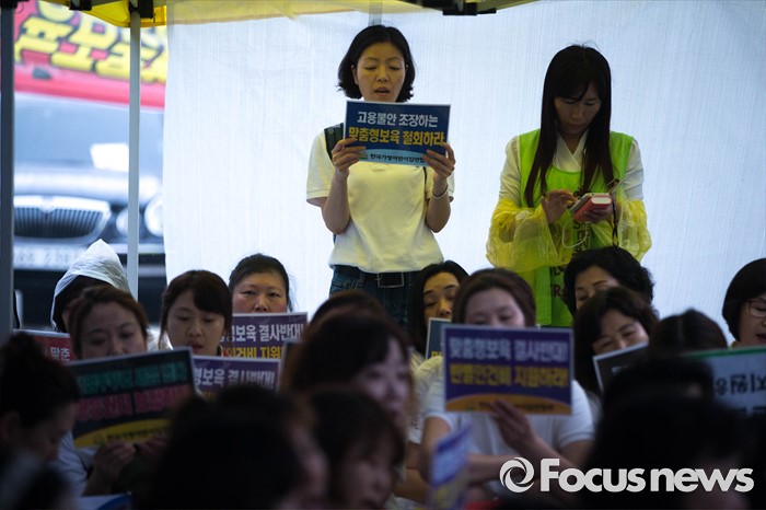 (서울=포커스뉴스) 22일 오후 서울 여의도 산업은행 본점 후문에서 한국가정어린이집연합회 비대위가 주최하는 '맞춤형 복지 시행 반대 단식 농성'이 열리고 있다.