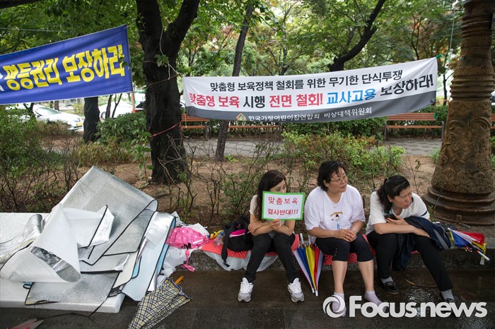 (서울=포커스뉴스) 22일 오후 서울 여의도 산업은행 본점 후문에서 한국가정어린이집연합회 비대위가 주최하는 '맞춤형 복지 시행 반대 단식 농성'이 열리고 있다.