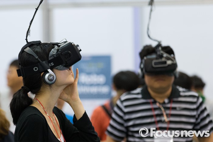 (고양=포커스뉴스) 22일 오후 경기 고양시 킨텍스 7홀에서 열린 2016 로보유니버스 & VR 서밋에 방문한 시민들이 VR 기기를 체험하고 있다.