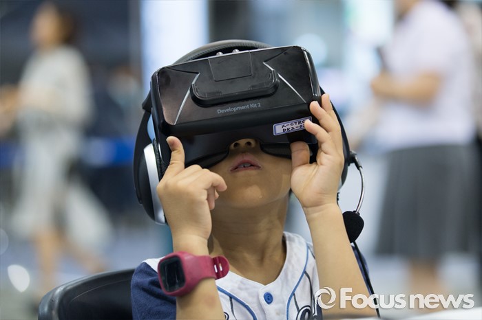 (고양=포커스뉴스) 22일 오후 경기 고양시 킨텍스 7홀에서 열린 2016 로보유니버스 & VR 서밋에 방문한 한 시민이 VR 기기를 체험하고 있다.