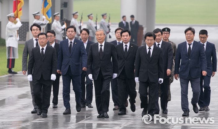(서울=포커스뉴스) 김종인 더불어민주당 비대위 대표와 의원들이 22일 오후 서울 동작구 국립서울현충원 내 국방부 유해발굴감식단 방문에 앞서 현충탑 참배를 위해 이동하고 있다.