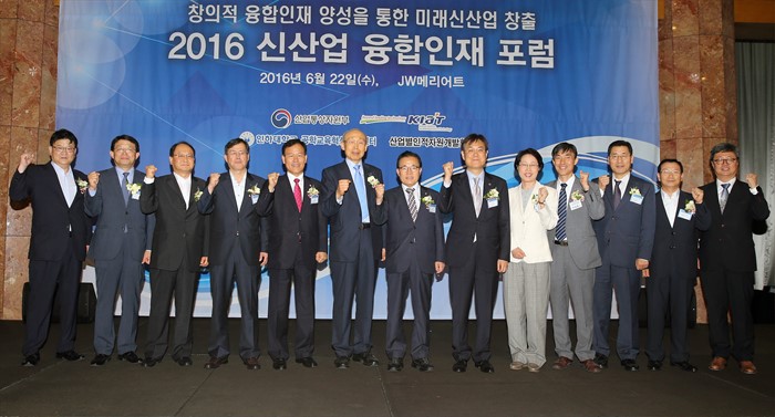 (서울=포커스뉴스) 이관섭 산업통상자원부 1차관이 서울 반포동 메리어트호텔 그랜드볼룸에서 미래융합 신산업 분야를 선도할 청년인재 양성을 위한 산업계와 공학교육혁신센터 간 장기적 협력 네트워크 구축을 위해 열린 '2016 신산업융합인재포럼'에 참석해 기념촬영 하고 있다. 이날 포럼에는 이채익·윤한홍 국회의원, 정재훈 산업기술진흥원장, 최순자 인하대 총장, 손 욱 서울대 차세대융합기술원 센터장, 주원종 서울과학기술대 교수, 이재근 IT비즈니스진흥협회 부회장, 염동관 플랜트산업협회 부회장, 김호열 바이오협회 부회장, 김태평 메디코넥스 대표를 비롯한 공학교육혁신센터 및 산학연 관계자 250여명이 참석했다. <사진제공=산업통상자원부>