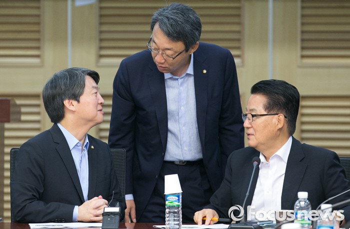 (서울=포커스뉴스) 23일 오전 서울 여의도 국회에서 열린 국민의당 19차 정책역량강화 워크숍에 참석한 안철수(왼쪽부터) 상임공동대표, 김성식 정책위의장, 박지원 원내대표가 대화하고 있다.