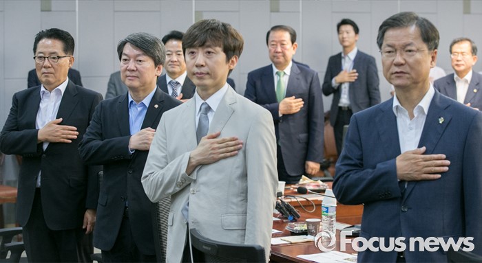 (서울=포커스뉴스) 23일 오전 서울 여의도 국회에서 열린 국민의당 19차 정책역량강화 워크숍에 참석한 천정배(오른쪽부터) 공동대표, 김희삼 광주과학기술원 교수, 안철수 상임공동대표, 박지원 원내대표 등 의원 및 참석자들이 국기에 대한 경례를 하고 있다.