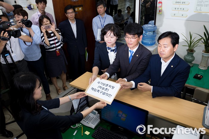 (서울=포커스뉴스) 야3당 원내수석부대표들이 23일 오전 서울 여의도 국회 의안과에서 박승춘 국가보훈처장 해임촉구결의안을 전달 하고 있다. 왼쪽부터 이정미 정의당 원내수석부대표, 박완주 더불어민주당 원내수석부대표, 김관영 국민의당 원내수석부대표.