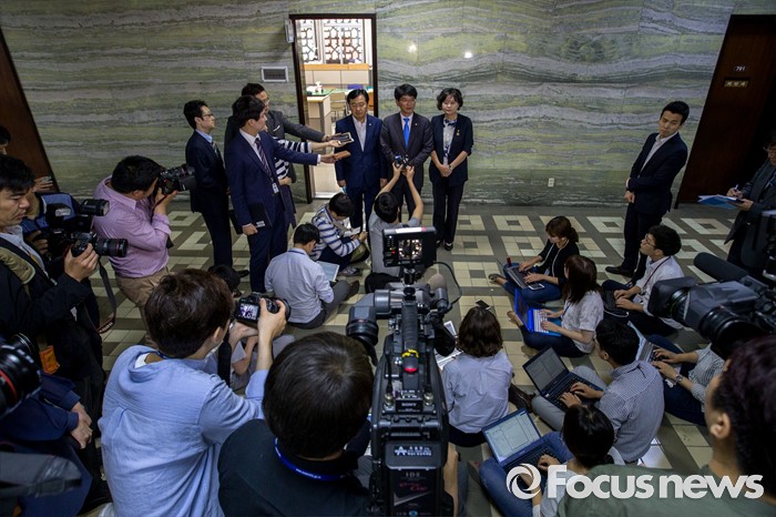 (서울=포커스뉴스) 야3당 원내수석부대표들이 23일 오전 서울 여의도 국회 의안과에서 박승춘 국가보훈처장 해임촉구결의안을 전달한 뒤 취재진 질문에 답하고 있다. 왼쪽부터 이정미 정의당 원내수석부대표, 박완주 더불어민주당 원내수석부대표, 김관영 국민의당 원내수석부대표.