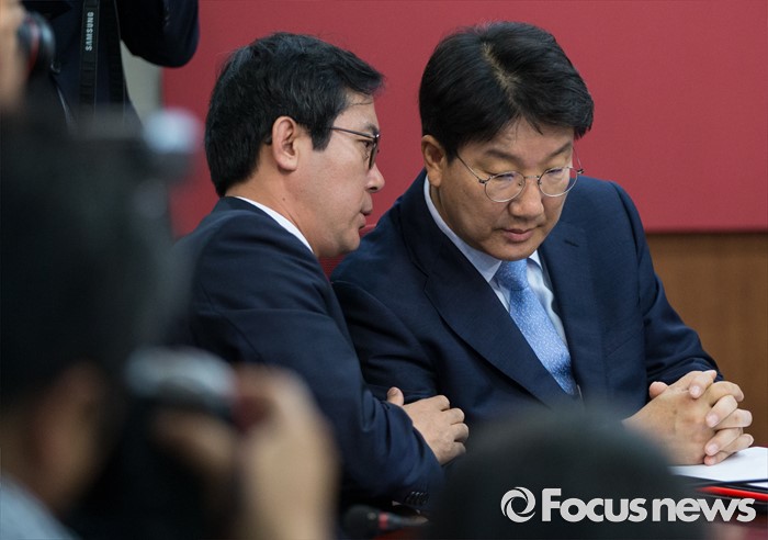 (서울=포커스뉴스) 사무총장직을 사퇴한 권성동(오른쪽) 새누리당 혁신비대위 사무총장이 23일 오전 서울 여의도 새누리당 당사에서 열린 혁신비상대책위원회 회의에서 김영우 의원과 대화하고 있다.