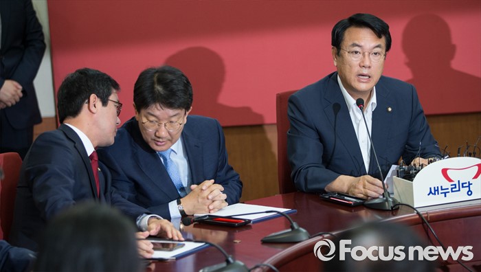 (서울=포커스뉴스) 사무총장직을 사퇴한 권성동(왼쪽 두번째) 새누리당 혁신비대위 사무총장이 23일 오전 서울 여의도 새누리당 당사에서 열린 혁신비상대책위원회 회의에서 김영우 의원과 대화하고 있다. 오른쪽 첫번째는 정진석 원내대표.