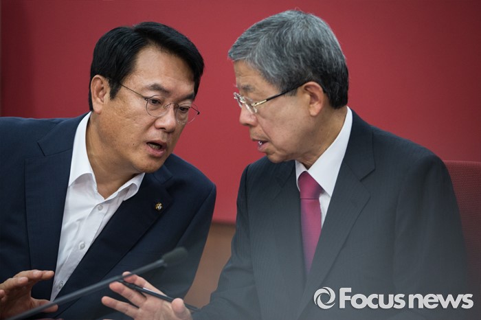 (서울=포커스뉴스) 정진석(왼쪽) 새누리당 원내대표가 23일 오전 서울 여의도 새누리당 당사에서 열린 혁신비상대책위원회 회의에서 김희옥 혁신위원장과 대화하고 있다.