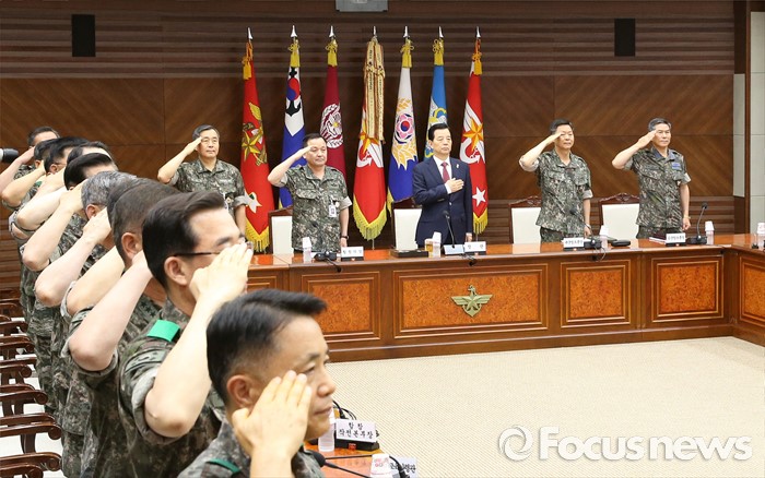 (서울=포커스뉴스) 북한이 무수단급 중거리 탄도미사일을 발사한 다음날인 23일 오전 서울 용산구 국방부 대회의실에서 열린 '2016년 전반기 전군 주요지휘관 회의'에 참석한 한민구 국방부 장관과 전군 지휘관들이 국민의례를 하고 있다.