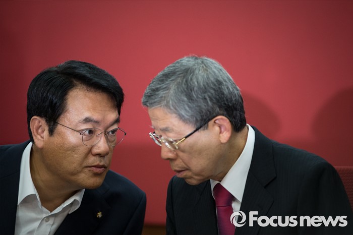 (서울=포커스뉴스) 정진석(왼쪽) 새누리당 원내대표가 23일 오전 서울 여의도 새누리당 당사에서 열린 혁신비상대책위원회 회의에서 김희옥 혁신위원장과 대화하고 있다.
