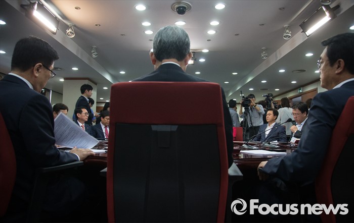 (서울=포커스뉴스) 김희옥 혁신위원장과 정진석 원내대표가 비대위원들과 함께 23일 오전 서울 여의도 새누리당 당사에서 열린 혁신비상대책위원회 회의에서 회의하고 있다. 왼쪽부터 김광림 정책위의장, 김 위원장, 정진석 원내대표.