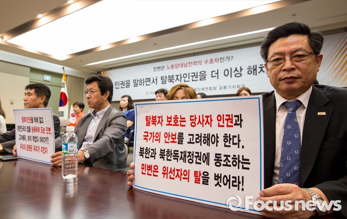 (서울=포커스뉴스) 23일 오전 서울 중구 프레스센터에서 열린 '12명 탈북민들을 사지로 내모는 민변 규탄 및 고발' 기자회견에서 탈북민단체연합 회원들이 민변을 규탄하는 손팻말을 들고 있다.