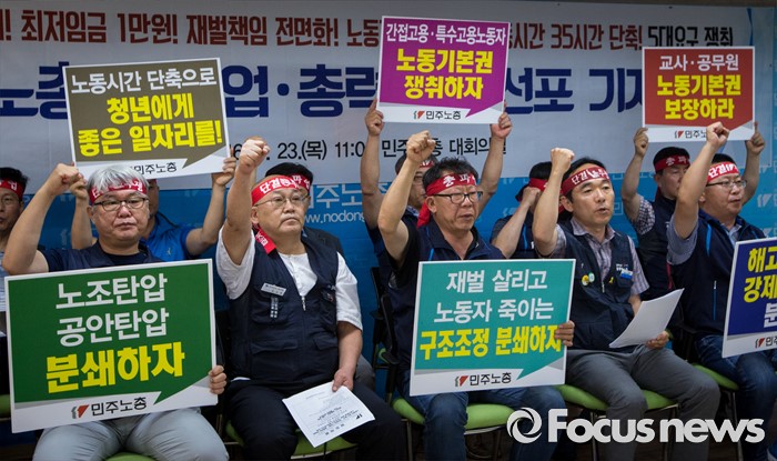 (서울=포커스뉴스) 23일 오전 서울 중구 민주노총 대회의실에서 열린 '민주노총 총파업ㆍ총력투쟁 선포' 기자회견에 참석한 최종진 수석부위원장 및 산별 대표자들이 총파업을 결의하는 구호를 외치고 있다.