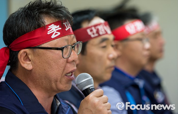 (서울=포커스뉴스) 23일 오전 서울 중구 민주노총 대회의실에서 열린 '민주노총 총파업ㆍ총력투쟁 선포' 기자회견에 참석한 최종진 수석부위원장이 총파업을 결의하는 발언을 하고 있다.