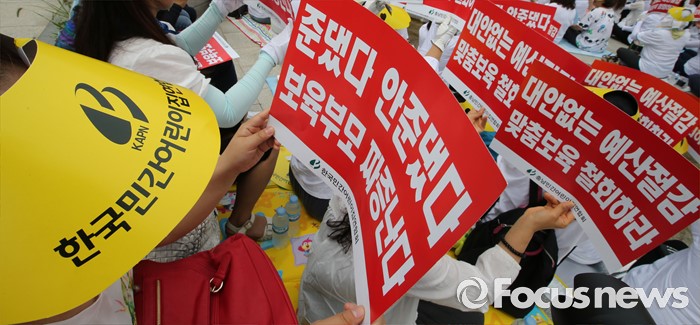 (세종=포커스뉴스) 23일 오전 세종시 정부세종청사 보건복지부 앞에서 충남민간어린이집연합회 회원들이 맞춤형보육 제도개선 및 시행연기 촉구 결의대회를 열고 있다.