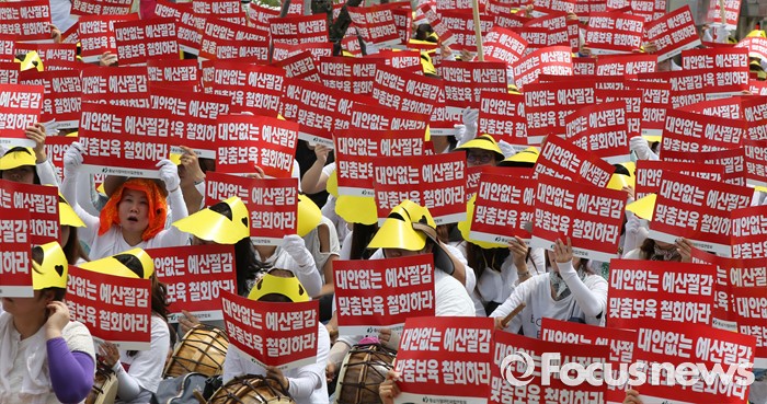 (세종=포커스뉴스) 23일 오전 세종시 정부세종청사 보건복지부 앞에서 충남민간어린이집연합회 회원들이 맞춤형보육 제도개선 및 시행연기 촉구 결의대회를 열고 있다.