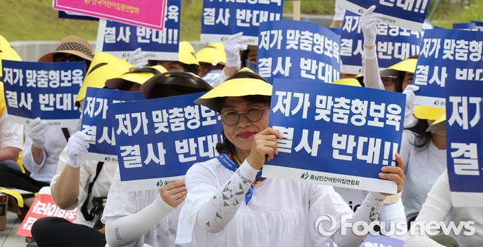(세종=포커스뉴스) 23일 오전 세종시 정부세종청사 보건복지부 앞에서 충남민간어린이집연합회 회원들이 맞춤형보육 제도개선 및 시행연기 촉구 결의대회를 열고 있다.
