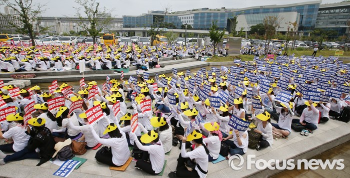 (세종=포커스뉴스) 23일 오전 세종시 정부세종청사 보건복지부 앞에서 충남민간어린이집연합회 회원들이 맞춤형보육 제도개선 및 시행연기 촉구 결의대회를 열고 있다.