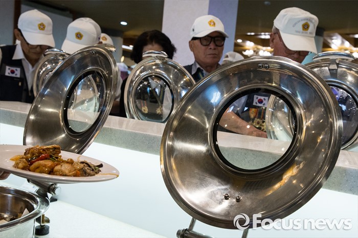 (서울=포커스뉴스) 23일 오전 서울 용산구 전쟁기념관 뮤지엄 웨딩홀에서 참전유공자들이 '6.25전쟁 참전유공자 위로연'에 참석해 식사를 준비하고 있다.