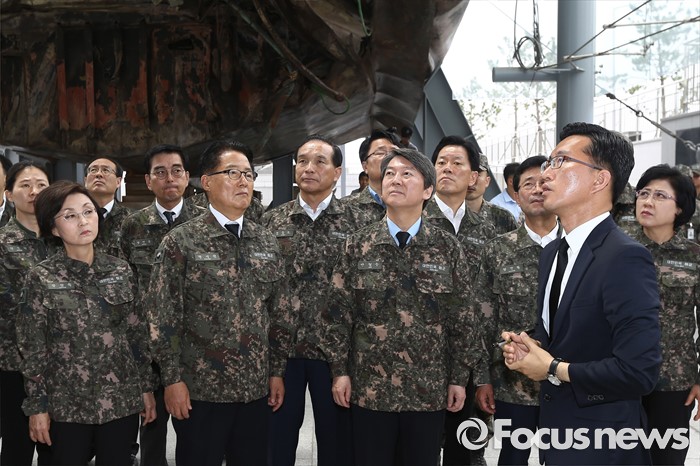 (서울=포커스뉴스) 안철수 국민의당 상임공동대표, 박지원 원내대표 등 의원들이 23일 오전 경기도 평택 해군 제2함대 사령부를 방문해 천안함 단면부를 둘러보고 있다.