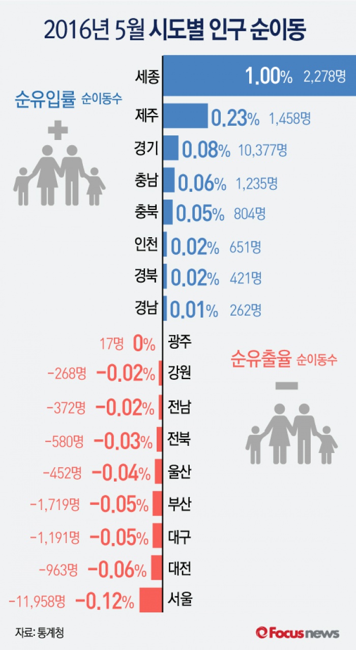 (서울=포커스뉴스) 23일 통계청에 발표한 ‘5월 국내인구이동통계’에 따르면 5월 시도별 순이동률에서는 세종이 가장 많은 1%를 차지했다. 반면 서울의 5월 순유출 인구는 -0.12%로 집계됐다.