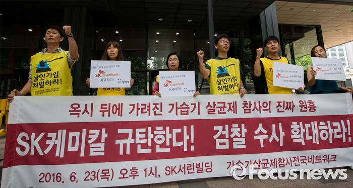 (서울=포커스뉴스) 23일 오후 서울 종로구 SK 본사 앞에서 열린 'SK케미칼 규탄 및 책임자 수사 촉구' 기자회견에서 가습기살균제참사전국네트워크 회원들이 SK케미칼을 규탄하는 구호를 외치고 있다.