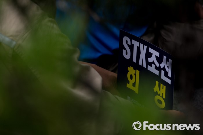 (서울=포커스뉴스) 23일 오후 서울 영등포구 KDB 산업은행 앞에서 STX조선해양노조원들이 일방적 조선업 구조조정 중단 및 공적자금 사용 내역 공개를 요구하는 결의대회를 하고 있다.