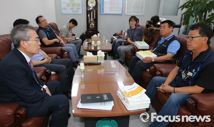 (세종=포커스뉴스) 최종진 민주노총 위원장 직무대행과 관계자들이 23일 오후 세종시 정부세종청사 고용노동부 최저임금위원장실에서 최저임금 1만원 서명지를 박준성 최저임금위원회 위원장에게 전달에 앞서 면담을 갖고 있다.