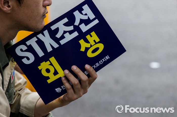 (서울=포커스뉴스) 23일 오후 서울 영등포구 KDB 산업은행 앞에서 STX조선해양노조원들이 일방적 조선업 구조조정 중단 및 공적자금 사용 내역 공개를 요구하는 결의대회를 하고 있다.