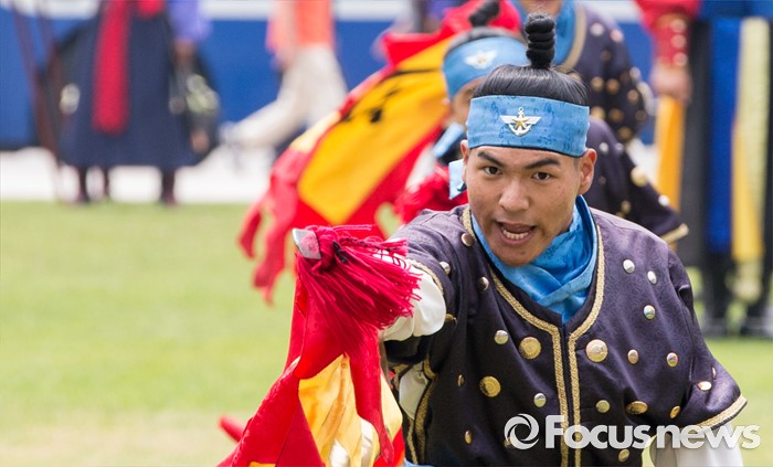 서울=포커스뉴스) 23일 오후 서울광장에서 열린 '왕궁수문장 20주년 기념행사'에 참석한 국방부 전통의장대원들이 무예 시범을 보이고 있다.