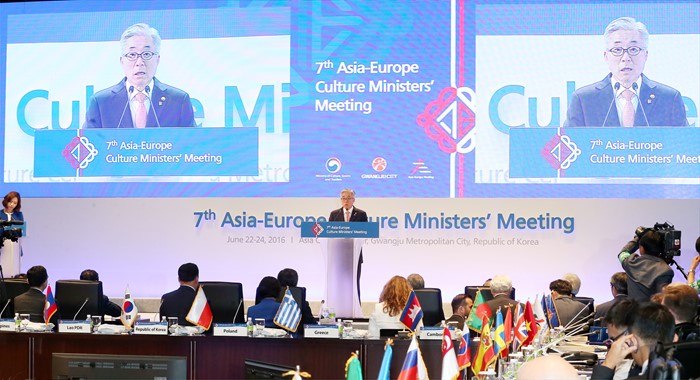 (광주=포커스뉴스) 제7차 ASEM 문화장관회의 개회식이 열린 23일 광주시 동구 국립아시아문화전당 국제회의장에서 김종덕 문화체육관광부 장관이 개회사를 하고 있다. <사진제공=문화체육관광부>