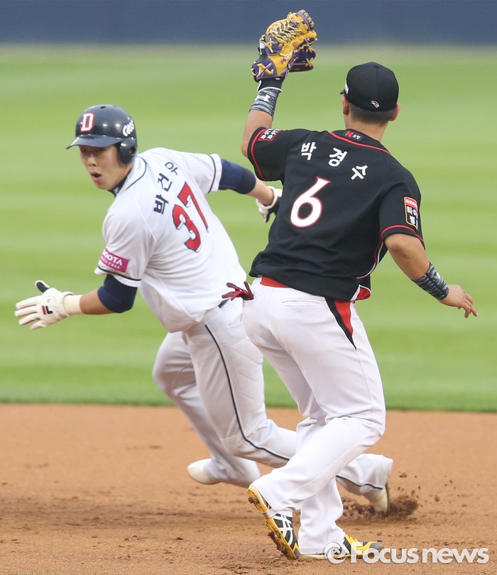 (서울=포커스뉴스) 23일 서울 잠실구장에서 열린 2016 프로야구 kt-두산 경기 1회말 무사 1루에서 두산 오재원의 2루 땅볼때 1루주자 박건우가 2루에서 kt 2루수 박경수에게 태그아웃되고 있다.