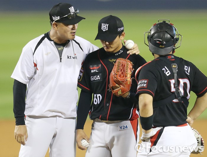 (서울=포커스뉴스) 23일 서울 잠실구장에서 열린 2016 프로야구 kt-두산 경기 6회말 2사 1,3루에서 kt 정명원 코치가 투수 교체를 위해 마운드에 올라가 선발투수 주권과 어깨동무를 하며 호투를 치하하고 있다.