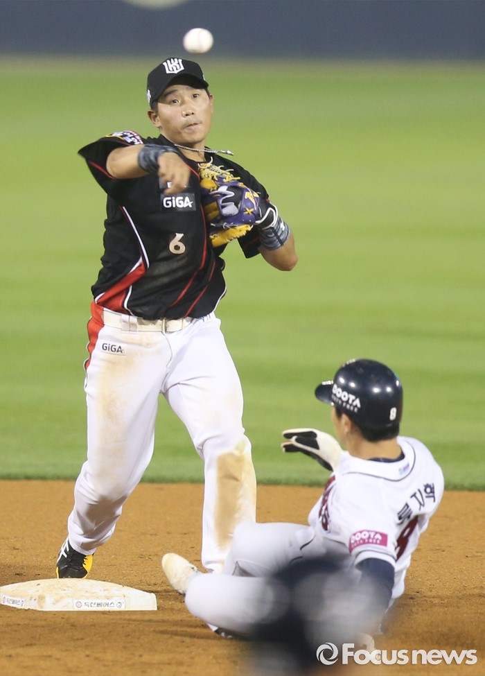 (서울=포커스뉴스) 23일 서울 잠실구장에서 열린 2016 프로야구 kt-두산 경기 8회말 1사 1,3루에서 kt 박경수가 두산 양의지의 유격수앞 땅볼때 1루 대주자 류지혁을 2루에서 포스아웃시킨후 1루로 송구해 더블플레이를 성공하고 있다.