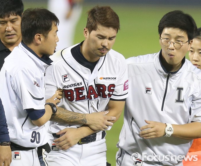(서울=포커스뉴스) 23일 서울 잠실구장에서 열린 2016 프로야구 kt-두산 경기 8회초 2사 1,2루에서 kt 김종민의 2루 땅볼때 두산 2루수 오재원이 1루주자 전민수와 충돌한 왼쪽 팔을 감싸쥐고 나오고 있다.