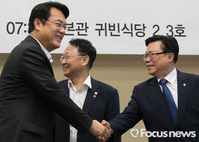 (서울=포커스뉴스) 24일 오전 서울 여의도 국회 귀빈식당에서 열린 2016년 하반기 경제정책방향 당정간담회에 참석한 정진석(왼쪽) 새누리당 원내대표와 이동필(오른쪽) 농림축산식품부 장관이 인사하고 있다. 가운데는 유일호 경제부총리 겸 기획재정부 장관.