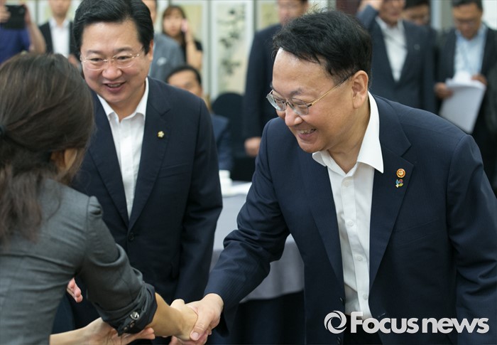 (서울=포커스뉴스) 24일 오전 서울 여의도 국회 귀빈식당에서 열린 2016년 하반기 경제정책방향 당정간담회에 참석한 유일호 경제부총리 겸 기획재정부 장관이 의원들과 인사하고 있다.