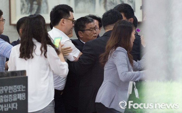 | △ 취재진 뿌리치는 추선희 사무총장 |